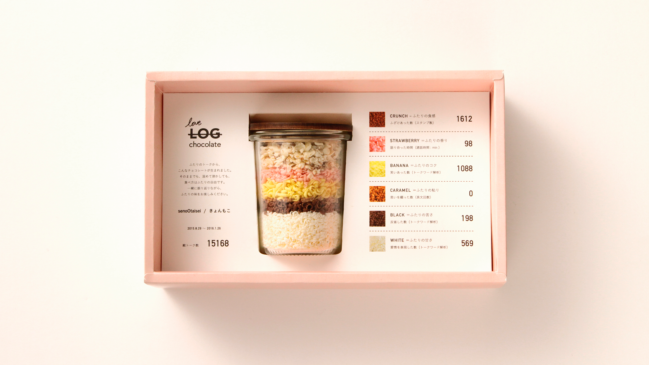 「バレンタインは、2人の会話を味わおう。」をコンセプトに新しいチョコレートをバレンタインデイにしかけました。学生の時の逆告白のような甘酸っぱさを忘れ、義理チョコ・友チョコといった文化に巻き込まれ、本当に大切な人とのチョコレートを見失ってしまった人たちに向けて、メッセージングアプリでの1年間の会話を機械学習に通し、チョコの味に変換することで二人だけの味に特徴のでるチョコレートを作成しました。